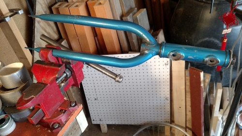 Build initially was cutting and fitting the bike fork pieces to the tube pieces. I cut off one of the bike fork tines because it was impeding the spinning of the wheel.