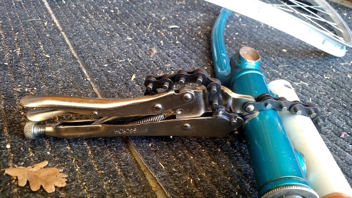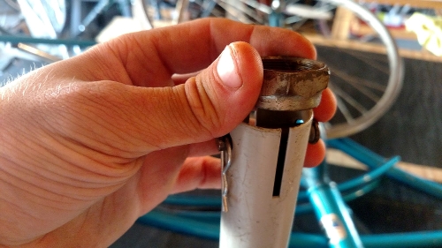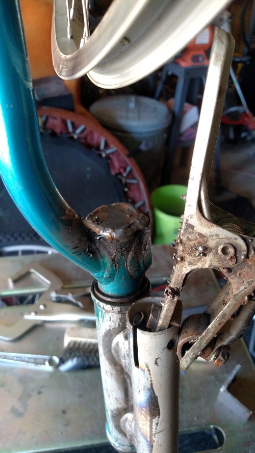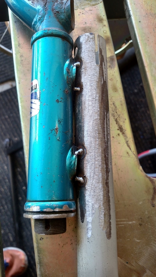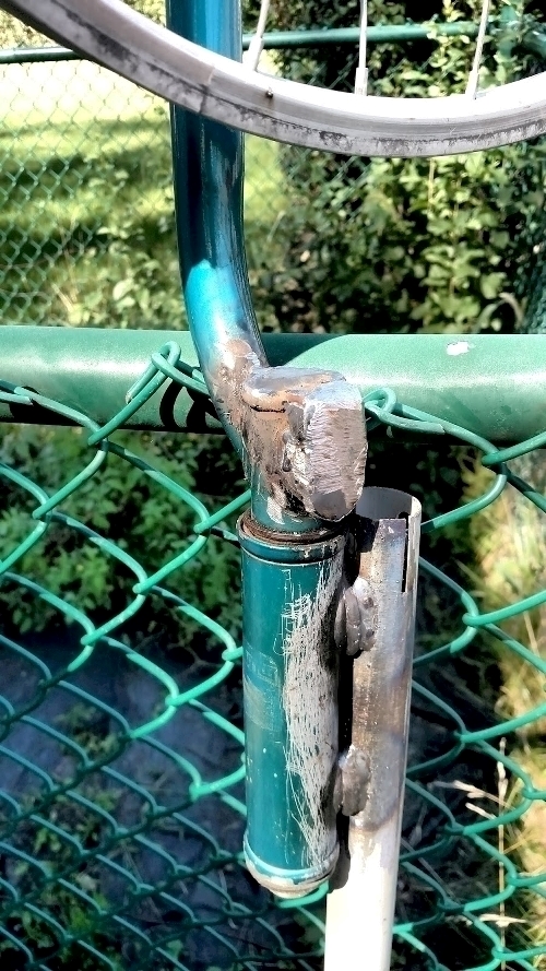 This was because the crashed wheel was very very out of tru (no longer consistently round). Initially I thought I would just weld the steerer tube to the long section of tube but this proved impossible as it would have impeded the rotation of the fork.